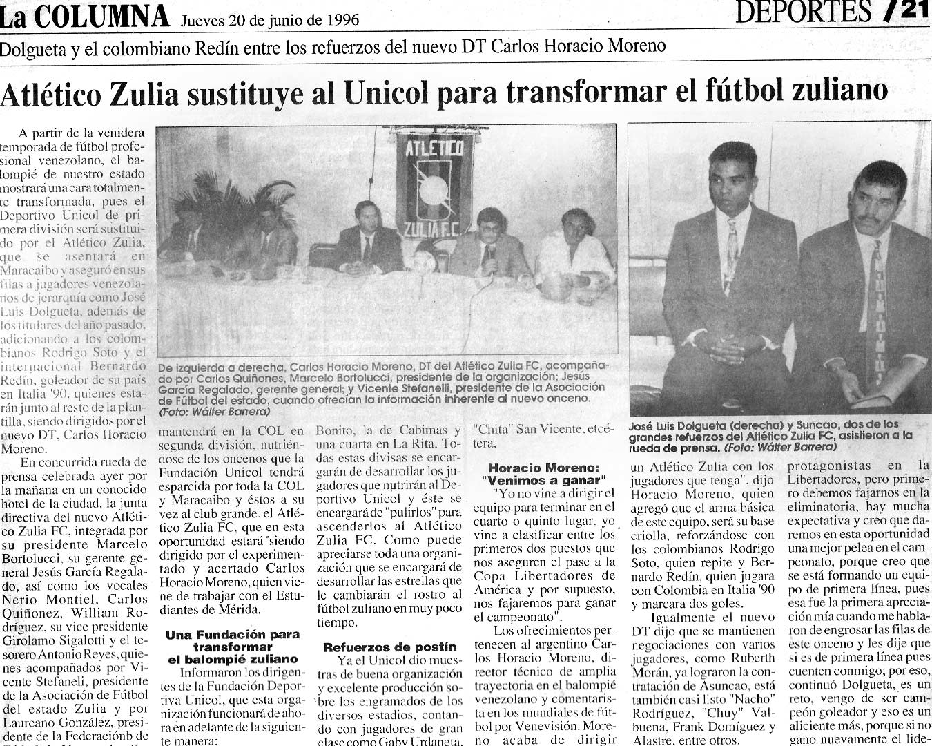 El Atlético Zulia Fútbol Club nació oficialmente en junio de 1996 por la necesidad de trasladar el equipo Deportivo Unicol desde la Costa Oriental del Lago hacia la ciudad de Maracaibo. El cuadro amarillo y verde de la COL era presidido por el Ing. Marcelo Bortolussi y venía realizando una encomiable labor en pro del fútbol en la zona donde participó en los campeonatos organizados por la Liga Profesional de Futbol y la Federación Venezolana de Fútbol, en las categorías menores, Aspirantes, Segunda y Primera División profesional.
